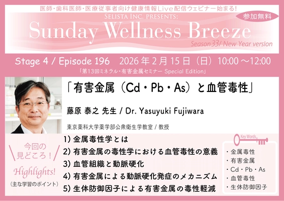 Selista Inc. Presents. 『Sunday Wellness Breeze』Season 28 New Year version 第12回ミネラル・有害金属セミナー Special Edition 全6 Stage 2025年1月19日(日)~3月9日(日)の日曜日の朝に開催