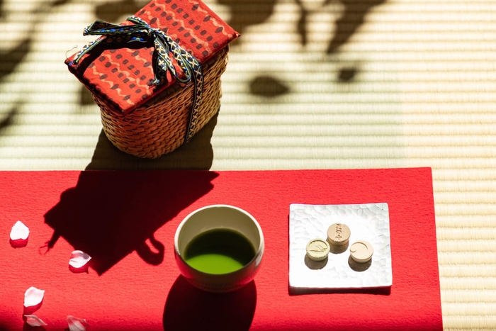 朝は畳敷きのデッキで野点体験をします。茶碗や茶筅(ちゃせん)などの茶道具が小さな籠に揃えられた星のや京都オリジナルの野点セットを使い、抹茶とお菓子を楽しみます。朝にお茶を飲むことはその日一日の福をもたらすと言われています。朝日に照らされた桜の下で、これから始まる一日に思いを馳せながらゆっくりとした朝の時間を過ごすことができます。