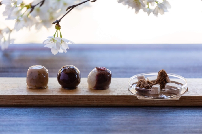 チェックイン後、オリジナル和菓子とウェルカムドリンクをテラスに用意します。和菓子は、1803年創業の京菓子司「亀屋良長」の烏羽玉(うばだま)です。桜餅の味や、味噌のまったりとした甘さに春の苦みがアクセントになった蕗味噌(ふきみそ)の味といった、春限定の烏羽玉を用意します。ウェルカムドリンクは、気分を高める桜色のスパークリングワインです。ソファでくつろぎながら、春の奥嵐山の静かな午後のひとときを楽しめます。