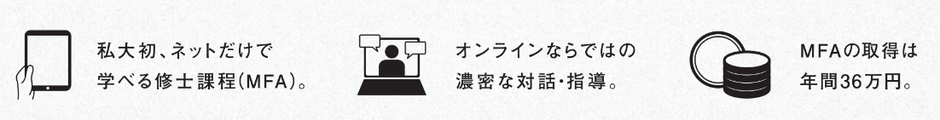 (1)日本初!ネットだけで取得可能な芸術修士(MFA)。100%オンライン学習により、インターネット環境があれば、いつでもどこでも学べます。