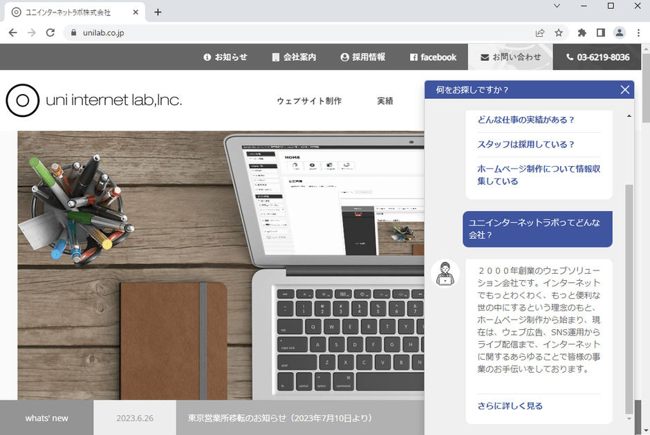 ウェブサイトのリニューアルをお考えの企業・団体様や、チャットボット機能を簡単に導入してみたい企業様は、ユニインターネットラボにお問い合わせください。