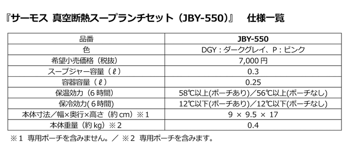 『サーモス 真空断熱スープランチセット(JBY-550)』は、普段スープジャーをご使用の方が、スープジャーにプラス一品という組み合わせで使用されていることに着目。真空断熱スープジャーに、汁漏れしにくいフタ構造の容器を加え、さらに収納にも持ち運びにも便利な専用ポーチをセットにしたアイテムです。スープジャーは食べきりサイズの300ml、容器は250mlで合計すると550mlと使いやすいサイズをご用意。専用ポーチは保温保冷に優れた断熱構造で、背面にはカトラリーを入れやすいミニポケット付きです。