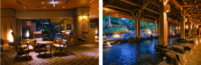 右:「風ノ音」と名称を新たにした大浴場。太い柱に支えられた高い天井と窓の外に広がる庭園を眺める広々とした内湯で紅葉狩りで冷えた体を温めてはいかがでしょうか。