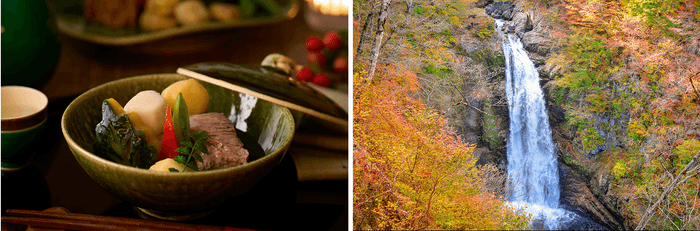 右:ホテルから車で約20分の「秋保大滝」。日本三名瀑のひとつに数えられ、豪快な滝の流れを取り囲むように色づく紅葉をお楽しみいただけます。例年の見頃は10月中旬から11月下旬頃まで。