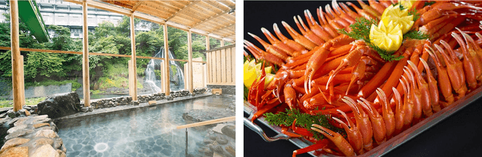 右:城崎温泉と言えば外湯めぐり。城崎温泉街の中心部まで徒歩でも約10分程度。外湯めぐりの無料バスも運行しているためロケーションの良さも魅力です。浴衣に籠を持って日中はもちろん、秋の夜長の散策もお薦めです。