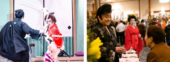 左:華麗な殺陣や華やかな衣装など、見どころ一杯いっぱいのお芝居は涙あり、笑いあり。
