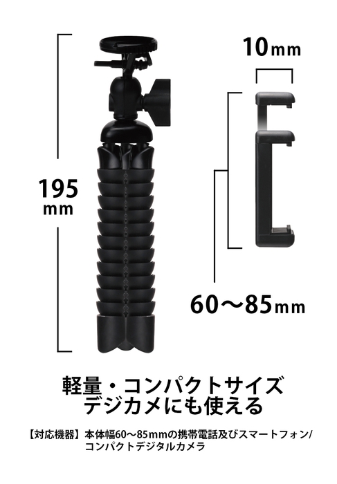 本体幅60~85mmの携帯電話及びスマートフォン/コンパクトデジタルカメラなどに対応した自由自在に変形するフレキシブル三脚