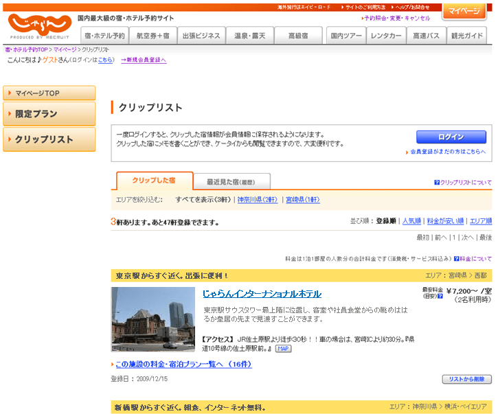 リクルート『じゃらんnet』の「クリップリスト」サービス登場、非会員でも利用可能!