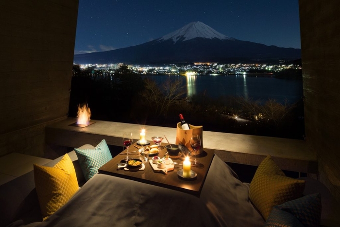 星のや富士のキャビンは、アウトドアライフを快適に楽しむために設計されています。自然との一体感を味わえるよう、壁一面の窓に向かってスコープのような作りになっており、キャビンの3分の1を占めるテラスリビングへ繋がります。一日中自然を近くに感じながら過ごせるよう、ファイヤープレイスと炬燵を設け、夜まで気持ちの良い滞在を楽しめます。中には桜を眺められるキャビンもあり、間近に広がる春の景色を独り占めできます。