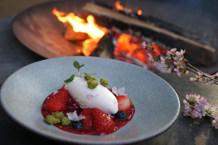 星のや富士では、キャビンや森の中のダイニングでアウトドア料理をラグジュアリーに楽しんでいただけます。キャビンでゆっくり過ごしたい方は、テラスリビングでの「グランピングカレー」がおすすめ。ボリュームたっぷりの牛肉と野菜を富士山の溶岩プレートでお客様ご自身でグリルし、5種類のスパイスを好きに組み合わせオリジナルの味に仕上げます。また、組数限定の屋外ダイニングでは狩猟肉ディナーを提供しています。春はさっぱりとした肉質になる猪や鹿を、山菜や筍などとともにグランピングマスターとダッチオーブンで仕上げます。デザートは桜のアイスクリーム。お客様ご自身でフレッシュないちごを火にかけて果実のソースを作り、桜のアイスクリームにかけていただきます。トッピングの抹茶のクランブルが味と食感にアクセントを効かせます。