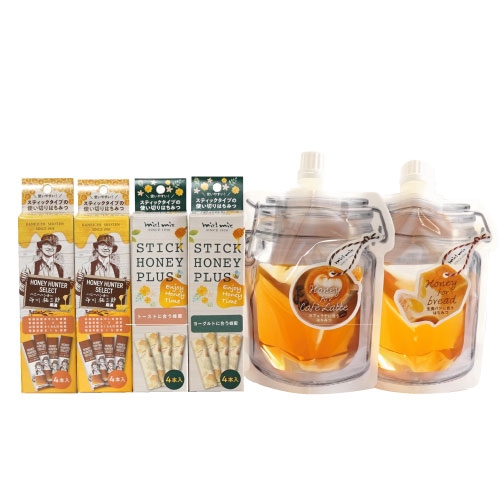 内容:人気のシールアップパウチ入りの用途別蜂蜜(カフェラテに合う蜂蜜、生食パンに合う蜂蜜≪各125g×2個≫)と、使い切りサイズでもち運びにも便利なスティックハニープラス3種類≪各32g(8g×4本入)×4個≫のセットです。まずはお試ししたい方におススメの福袋。