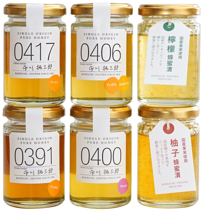 内容:国産シングルオリジンハニー4本と、人気の蜂蜜漬け2本が入って大変お得な初めての方にもおすすめのセットです。山形県産さくらんぼ蜂蜜、北海道産菩提樹蜂蜜、柚子蜂蜜漬など。各140g×6個。