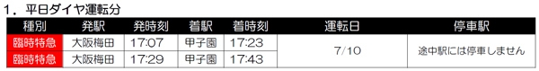 発車時刻等は予め阪神電車公式ホームページ( https://rail.hanshin.co.jp/ )の「お知らせ」や大阪梅田駅等の掲示板に掲載します。