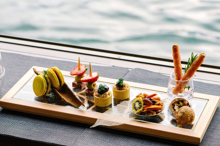 屋外テラスでは、山梨県を代表するワイナリーの一つ「勝沼醸造」が手掛ける「アルガブランカ ブリリャンテ」を提供します。日本固有のぶどう品種「甲州」で醸されたスパークリングワインです。絶景を眺めながら、ぶどう本来の優しい風味や、弾ける爽やかさを感じられるスパークリングワインの贅沢な味わいに酔いしれます。フレッシュな口当たりのお酒に合わせて、狩猟肉(ジビエ)やフルーツを使用したフィンガーフードを用意します。燦然と輝くダイヤモンドの色をイメージして作られたスパークリングワインは、美しいダイヤモンド富士を眺めながら楽しむのに最適です。