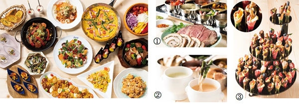 パンツァネッラ、ピンチョス、生ハム&黒胡椒春巻き、野菜の三色テリーヌ、ミニ ジャーサラダ、ラビオリ入りシチュー、白身魚のワイン蒸し ホワイトソース、海老のマヨネーズ和え アーモンド風味、マッシュポテトとミートボール、チーズとボロネーゼの衣揚げ、豚肉と野菜のワインビネガー風味、ほうれん草とベーコンの洋風卵とじ、ローストビーフ&ポルケッタ(画像(1))、カラフルプチコーンツリー(画像(3))鉄板焼きのチーズソース(画像(2)左:ブロッコリー風味、右:トマト風味)