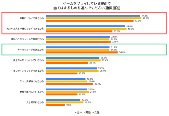 コロナ下で「お家時間」が増えたことにより、スキマ時間の充実や、友人とのコミュニケーションにゲームが寄与していることが伺える。女性の特徴は2位が「キャラクターが好きだから(36.0%)」となっており、『推しキャラ』が出ているゲームをプレイしているといった男性とは違った一面が垣間見えた。