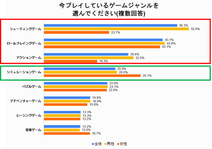 特に女性にフォーカスをするとシミュレーションゲームが根強い人気を誇りつつも、シューティングゲームをプレイする人も男性比率と変わらず存在しており、ゲームジャンルの好みも「ジェンダーレス化」が進んでいる点が特徴的でした。