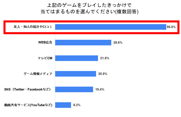 ゲームプレイのきっかけは「知人・友人からの紹介(56.6%)」が最も高く、以降は「WEB広告(28.6%)」「テレビCM(21.9%)」と続き、友人からの紹介が根強いことが分かった。