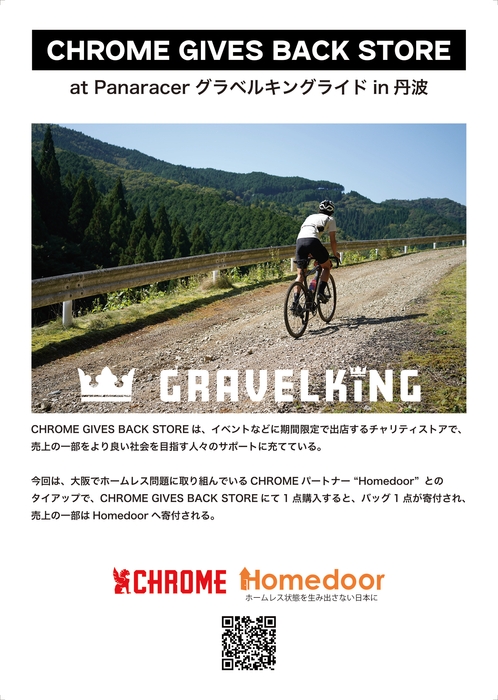 クローム・インダストリーズジャパン合同会社(所在地:東京都港区、代表:志賀剛史)は、2024年7月21日(日)に兵庫県丹波市にて開催されるCHROMEパートナー“Panaracer”主催の「パナレーサーグラベルキングライドin丹波」イベント会場に、CHROME GIVES BACK STOREを出店いたします。