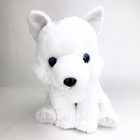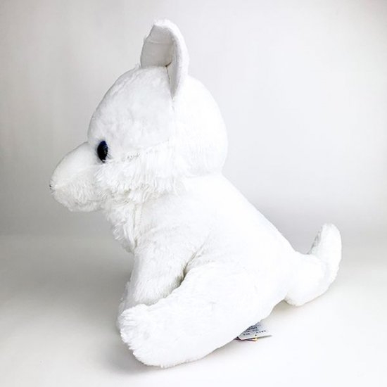 続いては、もふもふな毛並みがかわいい、オオカミくん。真っ白なボディにクリクリのおめめが凛とした印象です。お座りポーズもかわいくて、42×23×30cmサイズです。