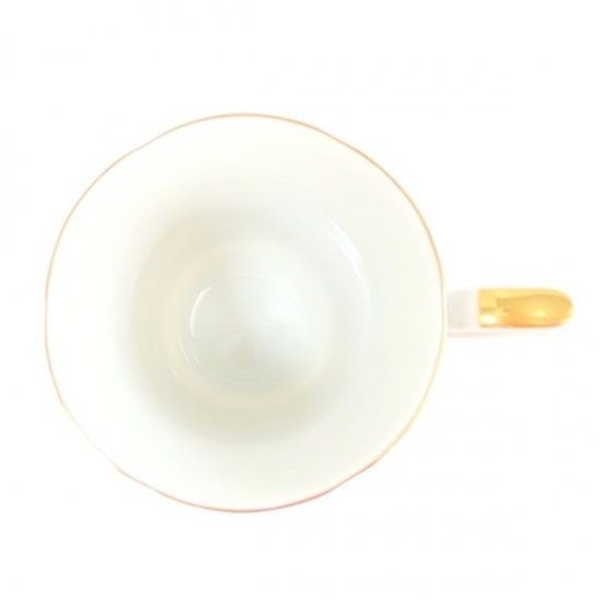 マグカップは高台タイプで、エレガントなフォルムが魅力です。持ち手の形にもこだわりを感じますよね。飲み口や高台、持ち手部分にはゴールドのラインも入っています。