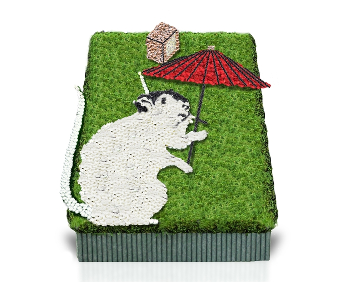 普段間近で見る事の出来ない花での表現を見るチャンスです。今回の月飾り(立体花壇”華魅(HANAMI)”)のテーマは干支の「ネズミ」に和傘を持たせ、太神楽の中の演目の一種で「傘の曲」を行っているシーンを表現いたします。