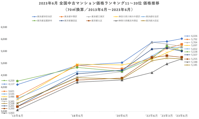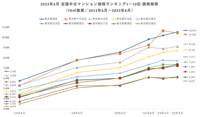 • 2023年5月の価格ランキングでは上位10件以内に「神奈川県川崎市中原区」がランクインしたが、6月は再び東京都23区で占められた。