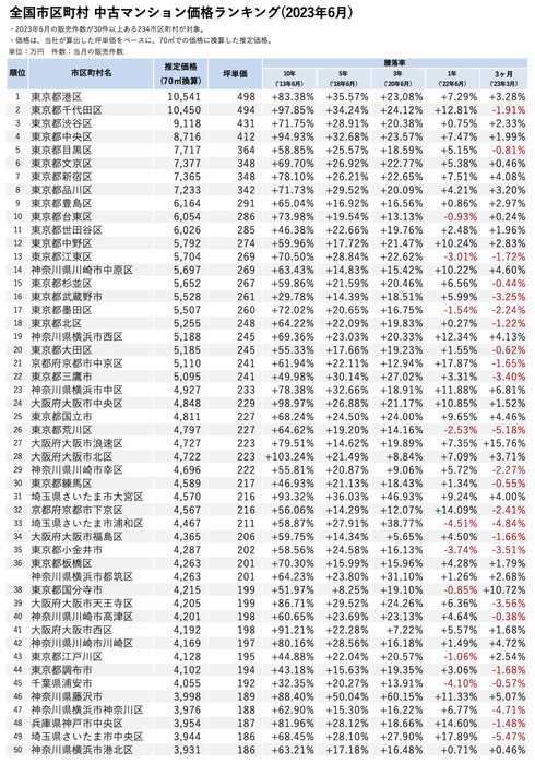 「マンションレビュー」2023年6月 全国市区町村 中古マンション価格/騰落率ランキング100を発表