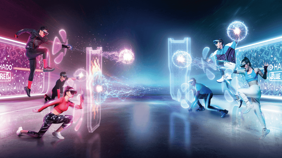 「HADO」は頭にヘッドマウントディスプレイ、腕にアームセンサーを装着して対戦するARスポーツです。自らの手でエナジーボールやシールドを発動させ、フィールドを自由に移動し、仲間と連携しながら最大3対3で対戦を楽しみます。