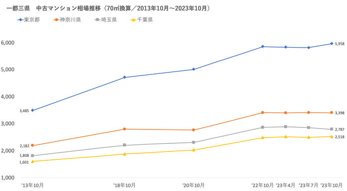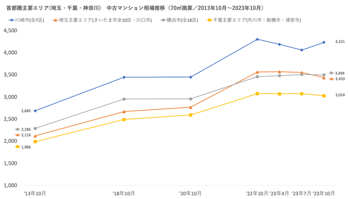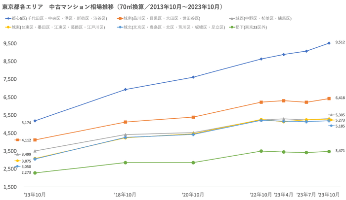 ■首都圏主要エリア 中古マンション相場推移(2013年10月~2023年10月)
