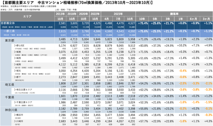 「マンションレビュー」2023年10月 全国主要エリア/47都道府県 中古マンション相場推移を発表