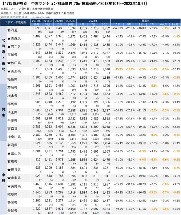 ■47都道府県別 中古マンション相場推移(2013年10月~2023年10月)