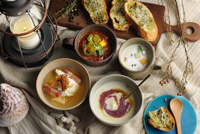 イベント開催にあわせてオープンする夜カフェでは、ランタンを片手にナイトピクニックが楽しめるメニュー「お散歩スープセット」を販売します。全4種類から好きな2種類を選ぶスープは、ハーブバターでカリッと焼いたバケットと一緒にバスケットに入れて提供します。購入者はランタンの貸し出しも利用でき、ランタン片手に見つけたお気に入りの場所で味わいます。