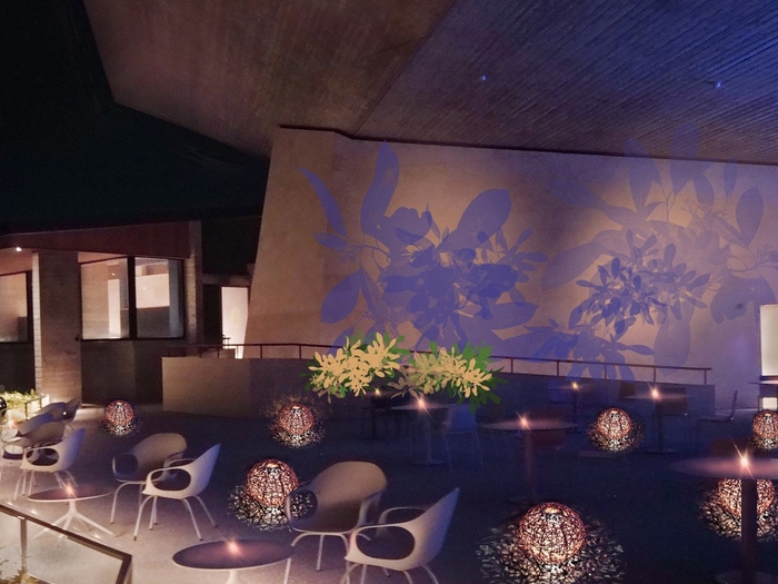 エントランスに位置する大屋根デッキに、大きなシダの葉やヤシの葉など温暖な沖縄ならではの植物でつくるアレンジメントが登場します。植物は高さ4mの琉球石灰岩の壁に影をつくり、森の中に迷い込んだような影絵遊びができる他、フォトスポットとしても楽しめます。