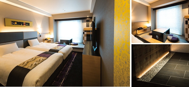 和洋のデザインが融合した客室(画像左)。畳の小上がり(画像右上)や石畳風のエントランス(画像右下)を採用するなど外国人ゲストが京都の雰囲気をお愉しみいただけるような空間に。