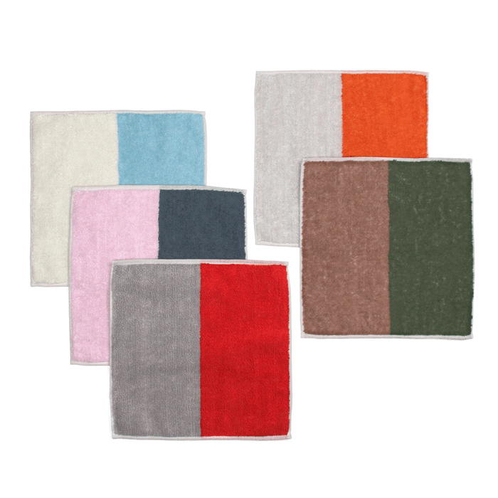 タオルを織る際にどうしても残ってしまい、タオル工場の倉庫に眠っていた半端な量の糸(残糸)から、相性の良い2色を選び、ハンカチに生まれ変わらせました。