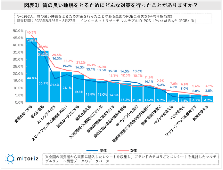 次に、限られた睡眠時間でより良い眠りに付けるように、どのような手法を取っているのか尋ねると、最も多く行われている対策は、「部屋を暗くする」(44.8%)の他、「早めに寝る」(35.9%)、「ストレッチを行う」(21.4%)の順に多く、「スマートフォン等の機器を見ない」(21.1%)を上回っていました。対策を行っている割合を男女別でみると、男性(60.6%)、女性(67.9%)とやや女性の方が関心が高い傾向です。