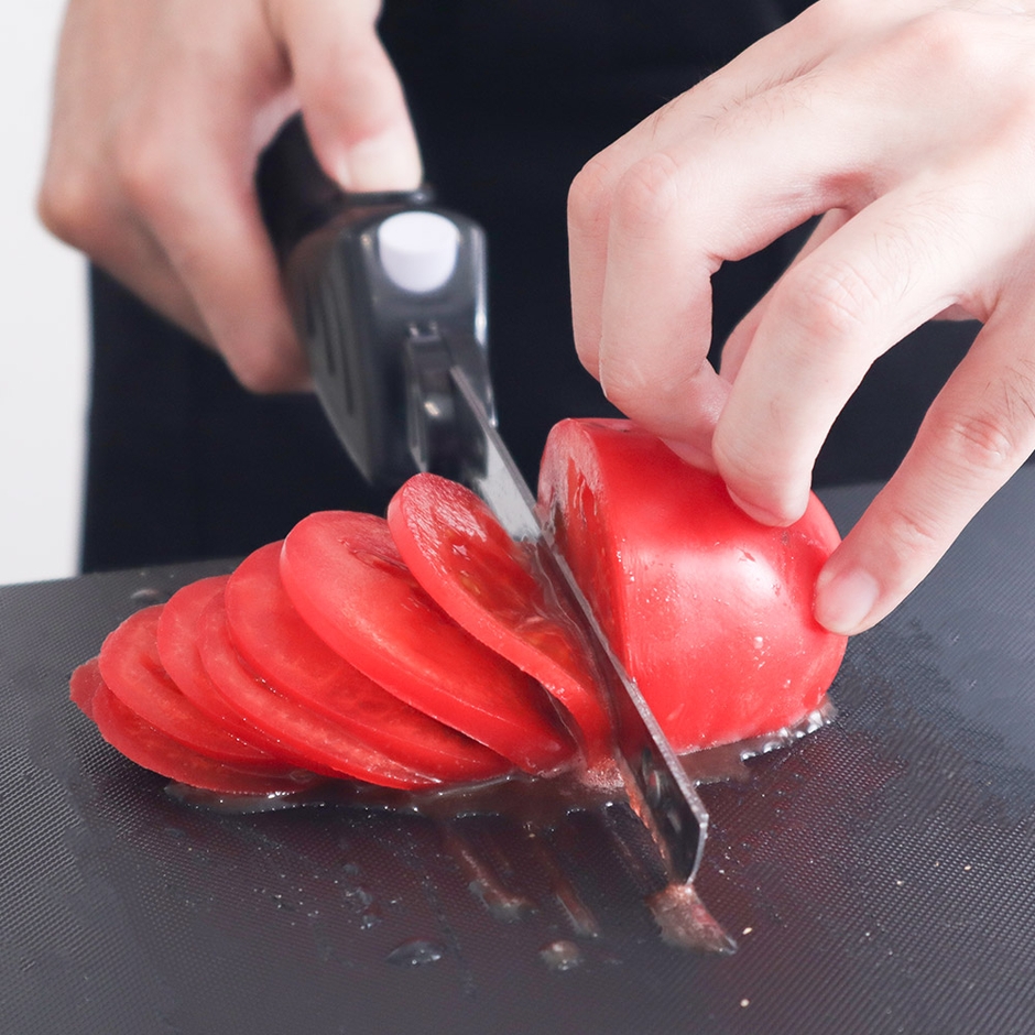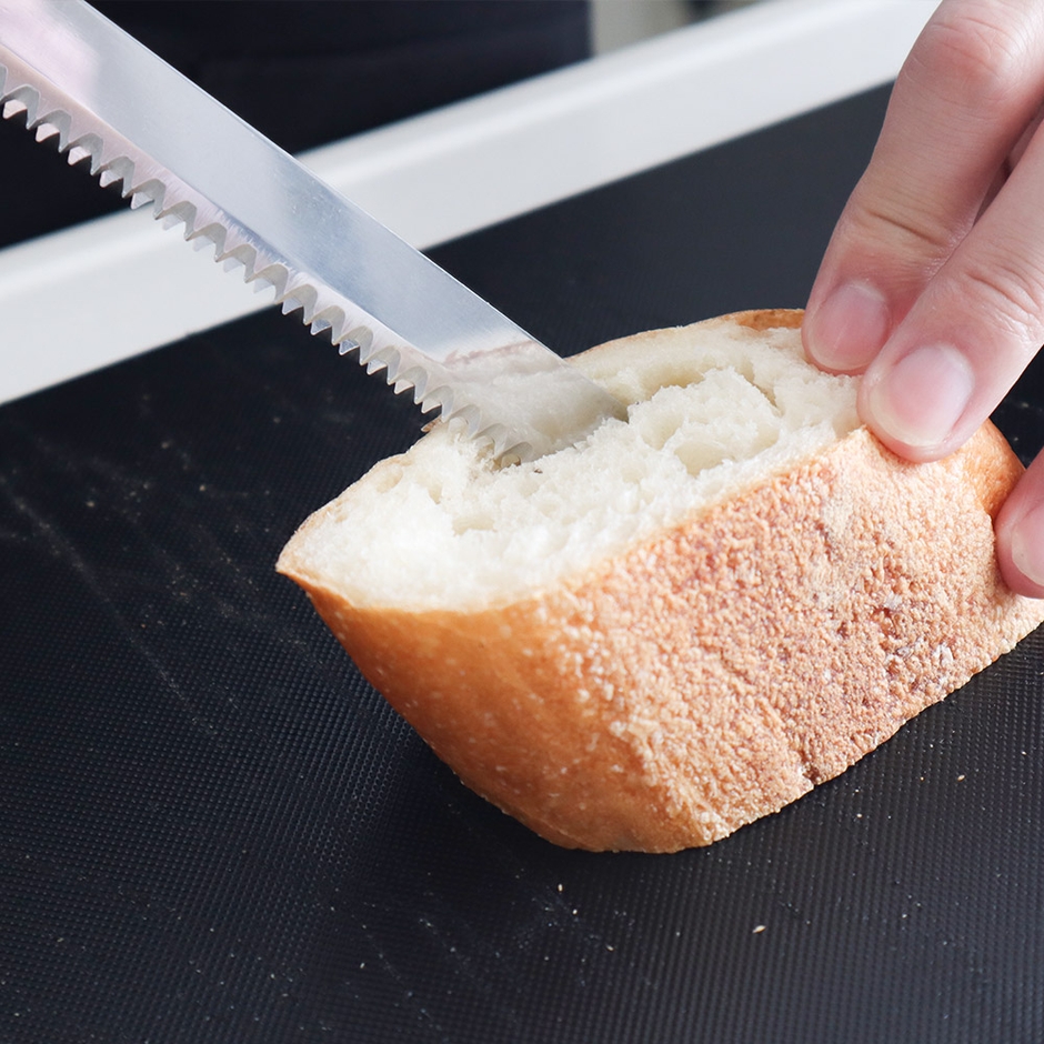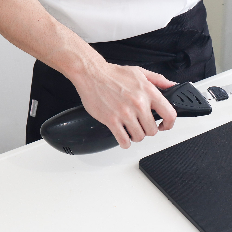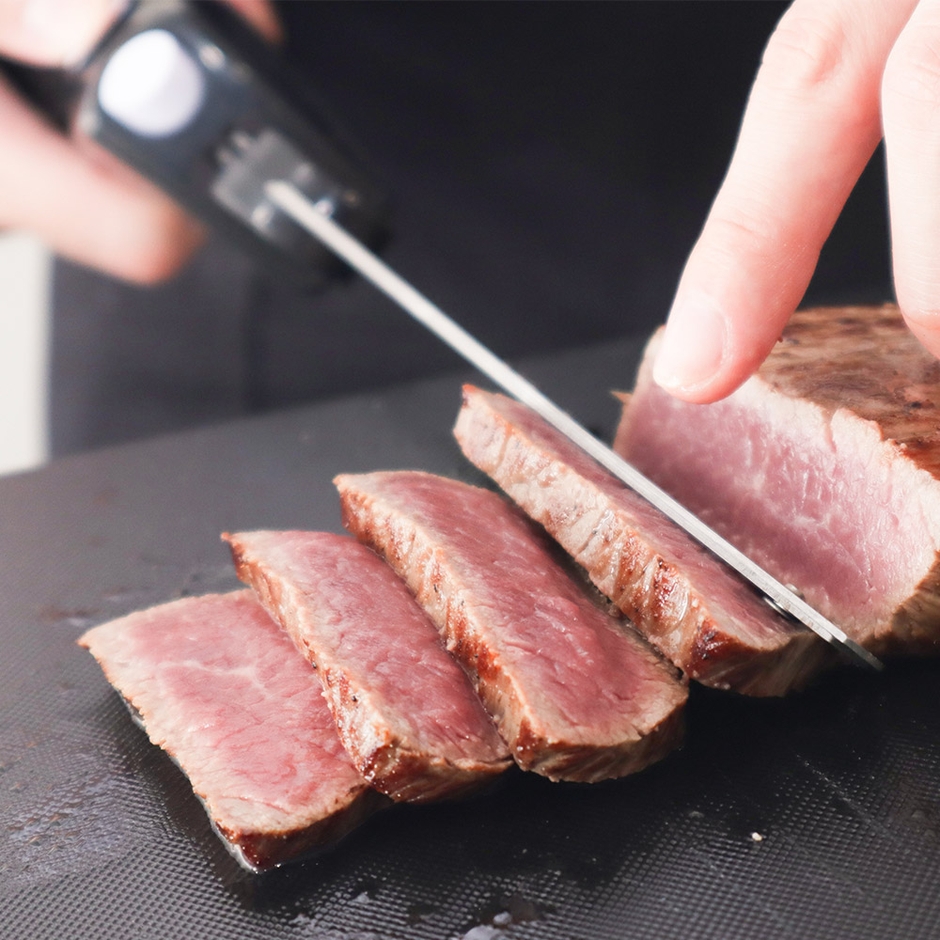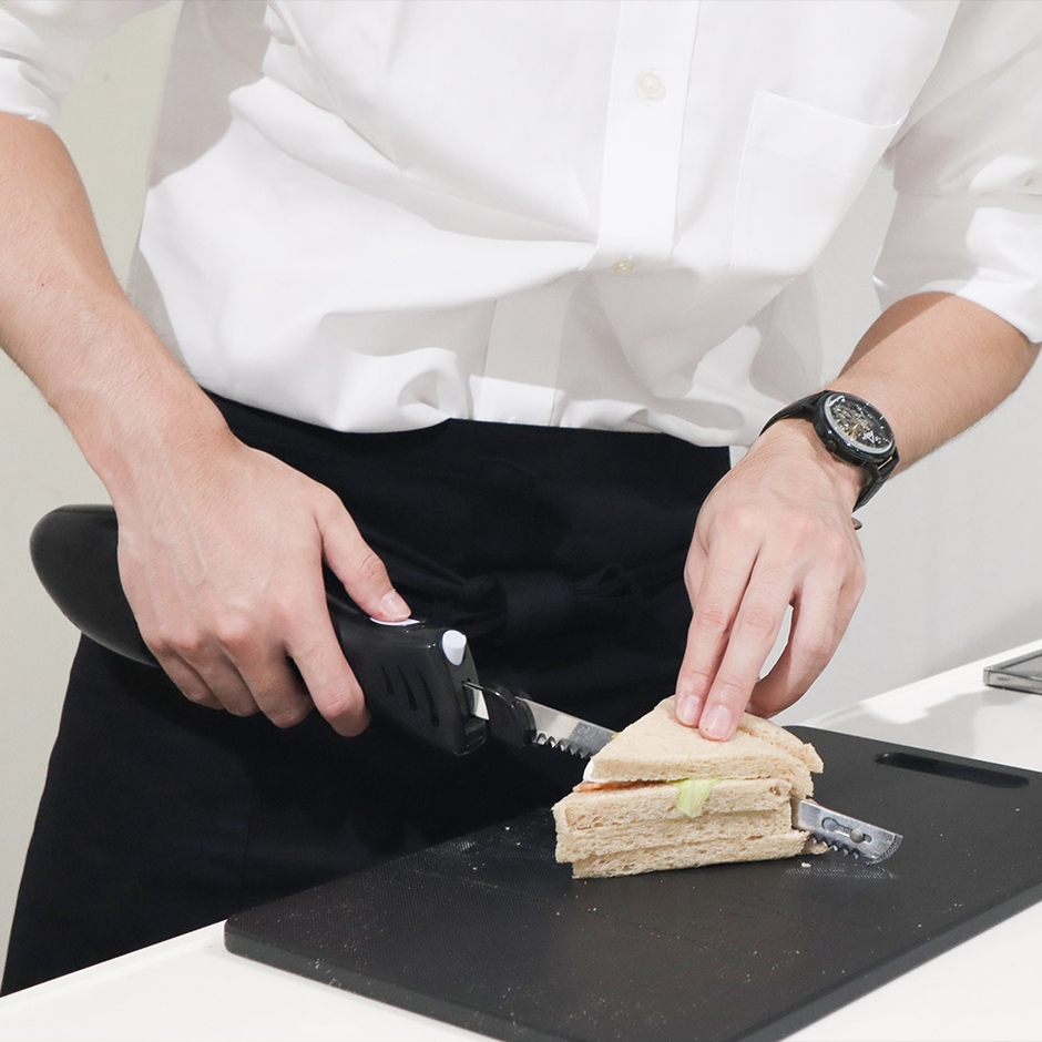切りたい食材に刃をあて、電源を入れると2枚のブレードが前後にスライドしながら食材をカットします。焼き立ての柔らかいパンや、ケーキ、トマト、お肉なども薄く綺麗に切ることが可能。ブレードは外して洗うことができます。ボタンを押している間だけ動作、万が一ボタンを離したら自動で止まる安全設計。家庭用コンセントからから充電して使え、コードレスでケーブルを気にすることなくお使いいただけます。