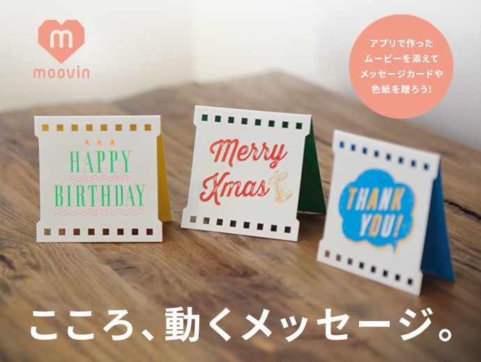UXENTが販売するメッセージカード(moovinカード)や色紙(moovinボード)を、専用アプリで撮影した動画やあらかじめスマホで撮影しておいた写真・動画をアプリ上で編集・加工して作成したメッセージムービーと紐付けてプレゼントできるサービスです。