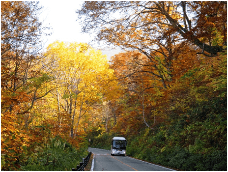 美女平~ブナ坂:紅葉街道を走行する高原バス