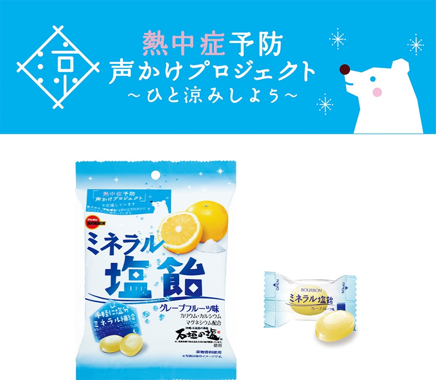 株式会社ブルボンは、この「熱中症予防声かけプロジェクト」に賛同し、発汗の季節に塩分やミネラルを手軽に補給できる「ミネラル塩飴」で2020年も参加しています。