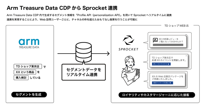 具体的には「Arm Treasure Data CDP」によってチャネルを横断して収集される顧客データからマーケターが戦略に基づき作成するセグメンテーション情報を「Sprocket」へ連携することによって、対象顧客の現在のロイヤリティやカスタマージャーニーに応じた接客をWebサイト上で行うことができるようになります。