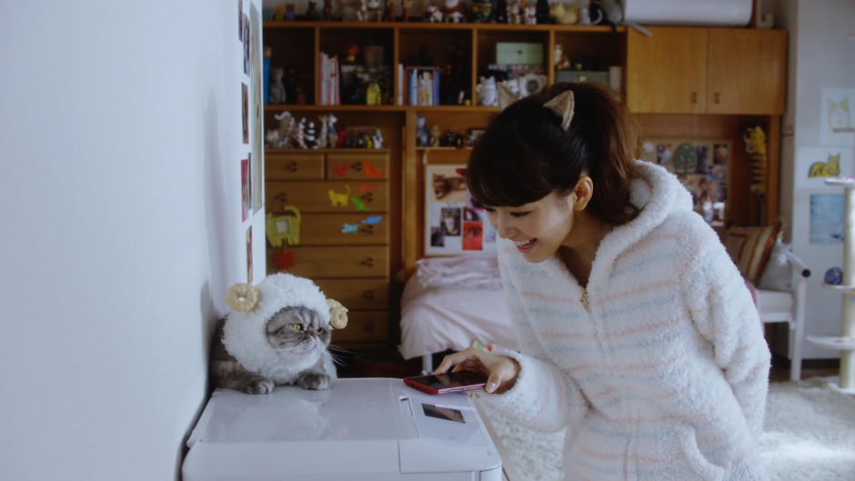 今回のCMは、猫溺愛キャラに扮した桐谷さんを描いたシリーズの続篇。年賀状用の写真として、ひつじの被り物をした飼い猫の写真を楽しそうに撮影する、猫耳姿の桐谷さんの姿を通じて、新PIXUSの特長であるプリントしたいスマホの写真をプリンターにかざすだけでカンタン、キレイにプリントできる機能「PIXUSタッチ(スマフォトプリント)」を紹介します。
