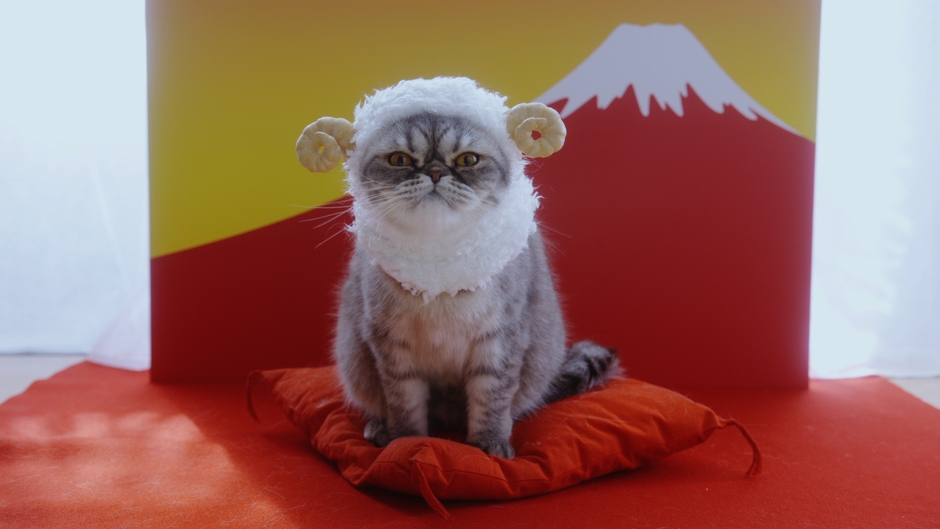 CMに登場する猫は、エキゾチックショートヘアーのレオンくん(♂・2歳)。ほうれい線を思わせる独特の口元と大きな瞳が印象的で、性格もおっとりしていることから、現場のマスコット的な存在としてみんなに可愛がられていました。「ひつじの被り物をした時の何とも言えない可愛さ。あれは最高ですよね。ずっと近くで見ていたくなります」と、桐谷さんもレオンくんの魅力に首ったけだったようで、撮影の間に少しずれて、目にかかりそうだった羊の被り物の位置を、桐谷さん自らやさしく直してあげる微笑ましい場面も見られました。