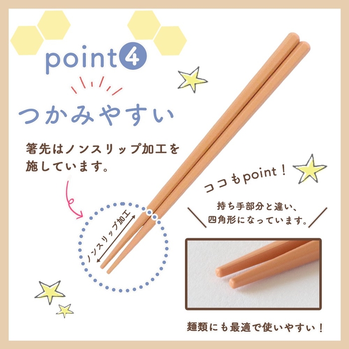 箸先にノンスリップ加工を施しているため、食材をしっかりつかめて、