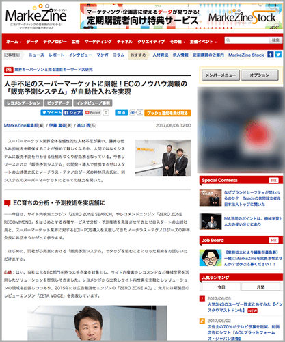 EC商品検索・レコメンドを開発販売するEC TECHのリーディングカンパニーである株式会社ゼロスタート(本社:東京都世田谷区、代表取締役社長:山崎徳之、以下ゼロスタート)の、インタビュー記事『人手不足のスーパーマーケットに朗報!ECのノウハウ満載の「販売予測システム」が自動仕入れを実現』が株式会社翔泳社が運営する「MarkeZine」に掲載されました。