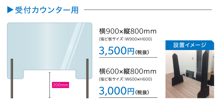 対面で接客・商談をされる受付カウンターなどに、置くだけ設置で接客環境を飛沫しづらい安心感のある状態にするパーテーションです。透明素材は、柔らかくて割れにくい塩ビ板を使用しており、左右の切れ込みに足となる板を差し込むだけで自立式のパーテーションが完成します。