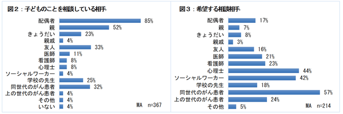 ・今回の調査では、子どもへの説明の支援として「同様の体験を持つ人からの助言」を希望している方の割合が多く、「同世代のがん患者さん」に子どもに関する相談を希望している方の割合も多かったです。結論: