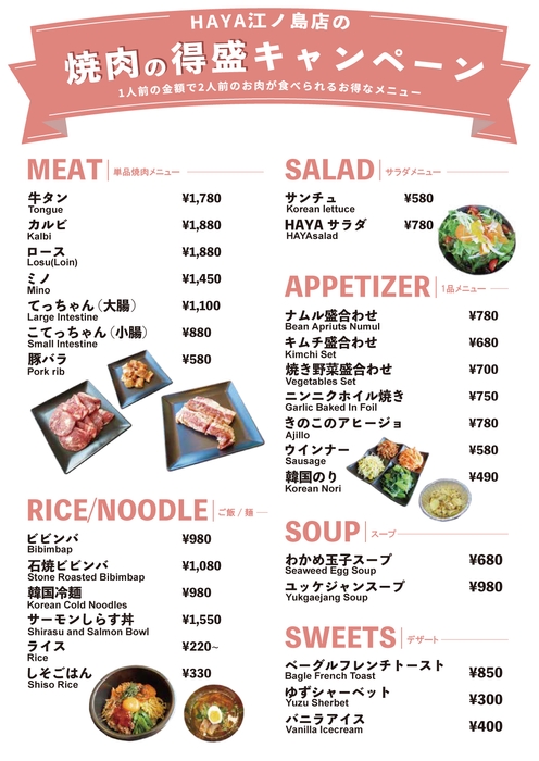 HAYA 江ノ島店で実施中の平日限定!お得な「焼肉得盛りキャンペーン」でお得に焼肉をお楽しみいただけます。夏の江ノ島観光や、海遊びの休憩に、美味しいお肉でエネルギーチャージ!平日の17:00以降ご利用いただけます。