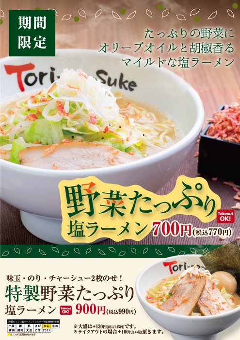 株式会社ウィズリンク(本社・広島県広島市安佐南区伴南 代表取締役社長 富谷薫)が展開するフランチャイズラーメンチェーン「とりの助」では、9月18日(金)から期間限定で「野菜たっぷり塩ラーメン」を発売します。